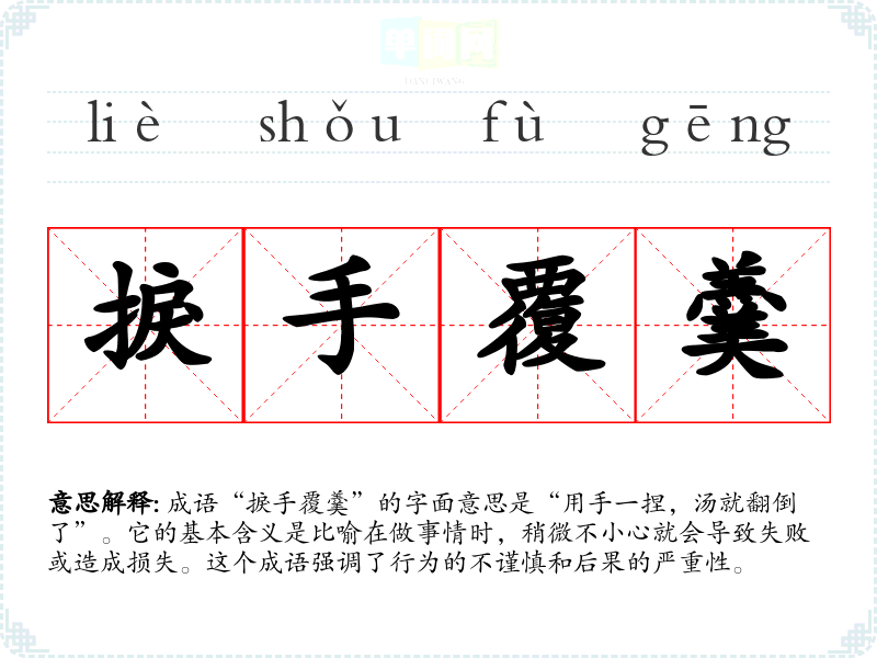 成语“捩手覆羹”的字面意思是“用手一捏,汤就翻倒了”。它的基本含义是比喻在做事情时,稍微不小心就会导致失败或造成损失。这个成语强调了行为的不谨慎和后果的严重性。