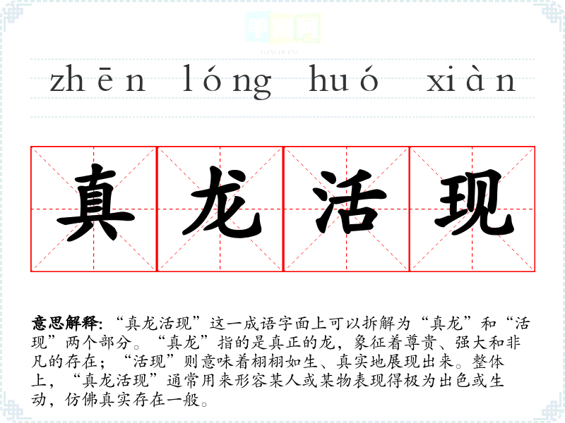 “真龙活现”这一成语字面上可以拆解为“真龙”和“活现”两个部分。“真龙”指的是真正的龙,象征着尊贵、强大和非凡的存在;“活现”则意味着栩栩如生、真实地展现出来。整体上,“真龙活现”通常用来形容某人或某物表现得极为出色或生动,仿佛真实存在一般。