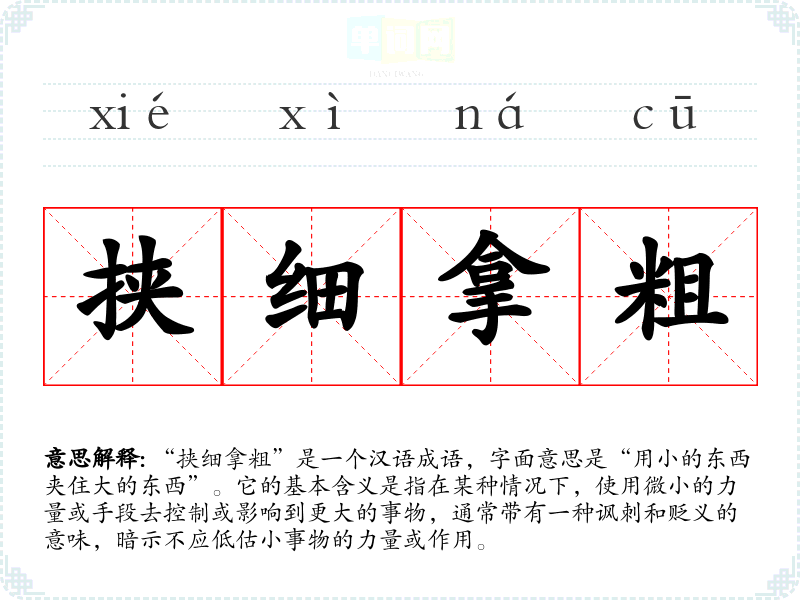 “挟细拿粗”让我联想到那些看似微不足道却能改变事物发展的细节。它带给我的情感是积极向上的,提醒我在生活和工作中不要忽视小事的重要性。