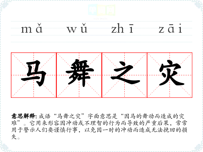 成语“马舞之灾”字面意思是“因马的舞动而造成的灾难”。它用来形容因冲动或不理智的行为而导致的严重后果,常常用于警示人们要谨慎行事,以免因一时的冲动而造成无法挽回的损失。