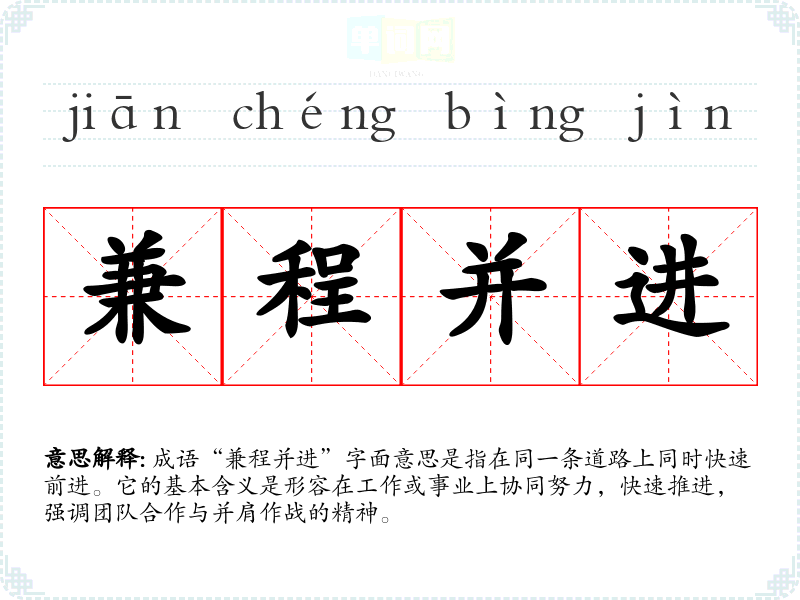 成语“兼程并进”字面意思是指在同一条道路上同时快速前进。它的基本含义是形容在工作或事业上协同努力,快速推进,强调团队合作与并肩作战的精神。