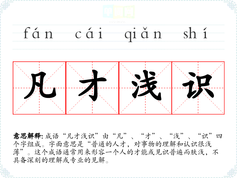 “凡才浅识”源自古代汉语的*惯用法,虽然没有明确的典故或文学出处,但其构成的字词反映了古人对才智和见识的重视。成语中“凡”字常用于表示普通、一般的意思,而“浅识”则强调知识和理解的表面性和肤浅性。