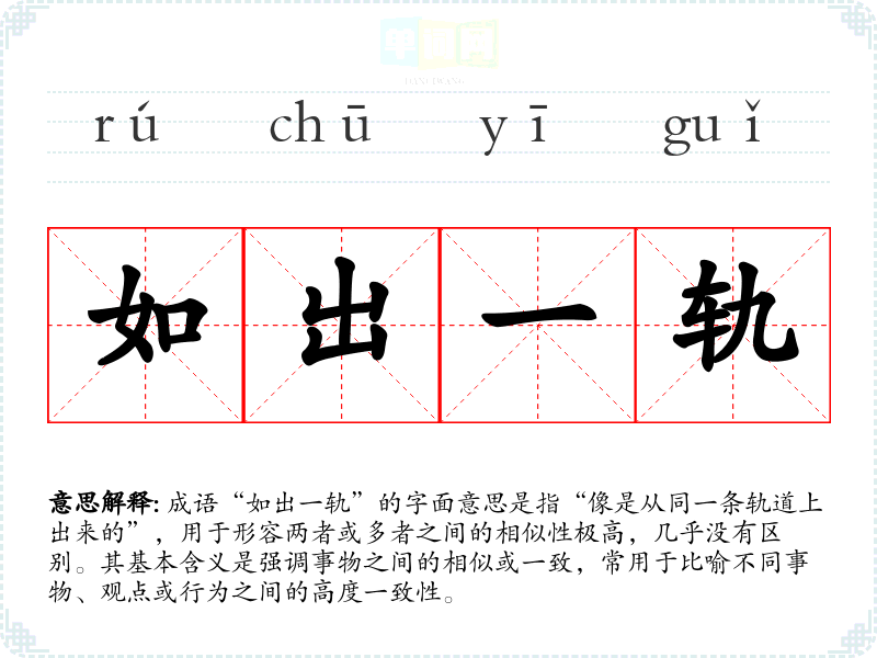 成语“如出一轨”的字面意思是指“像是从同一条轨道上出来的”,用于形容两者或多者之间的相似性极高,几乎没有区别。其基本含义是强调事物之间的相似或一致,常用于比喻不同事物、观点或行为之间的高度一致性。