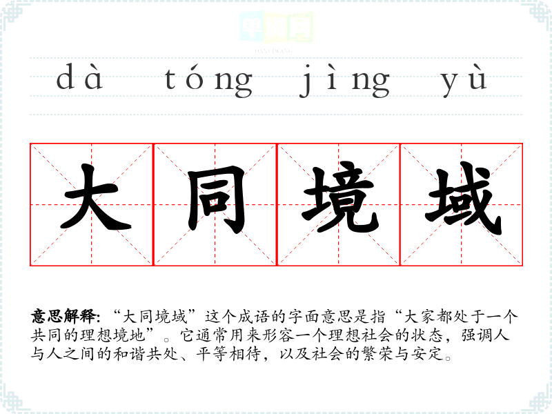 “大同境域”这个成语的字面意思是指“大家都处于一个共同的理想境地”。它通常用来形容一个理想社会的状态,强调人与人之间的和谐共处、平等相待,以及社会的繁荣与安定。