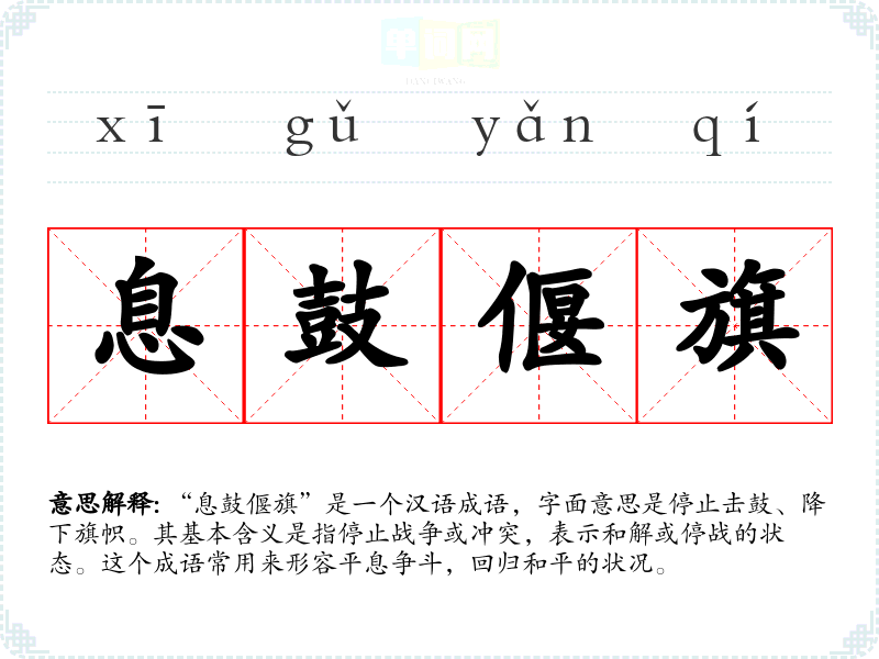 “息鼓偃旗”是一个汉语成语,字面意思是停止击鼓、降下旗帜。其基本含义是指停止战争或冲突,表示和解或停战的状态。这个成语常用来形容平息争斗,回归和平的状况。