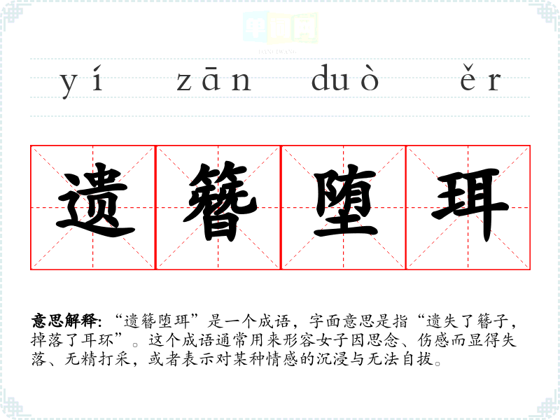“遗簪堕珥”是一个成语,字面意思是指“遗失了簪子,掉落了耳环”。这个成语通常用来形容女子因思念、伤感而显得失落、无精打采,或者表示对某种情感的沉浸与无法自拔。