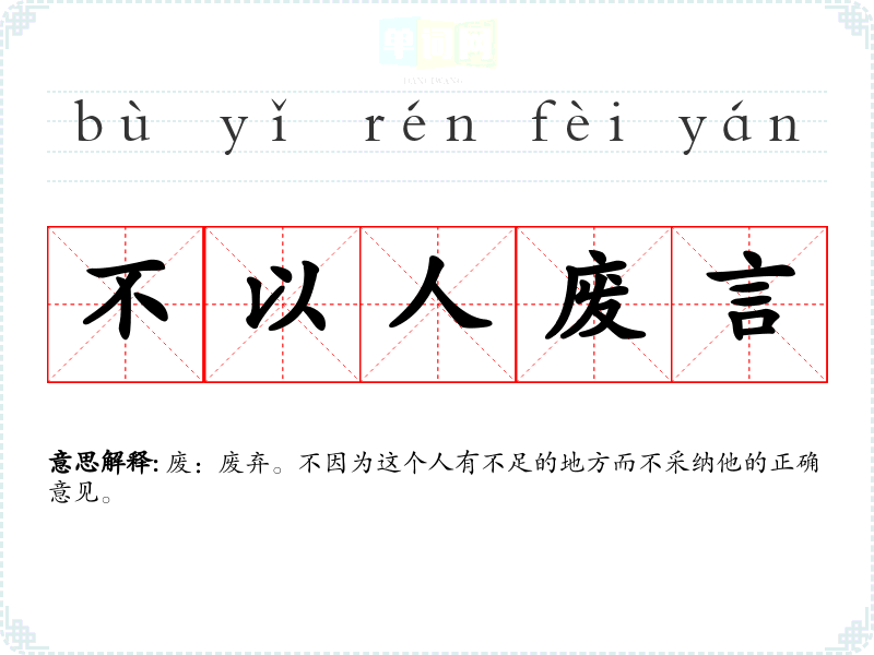 | 不以人废言 | 废:废弃。不因为这个人有不足的地方而不采纳他的正确意见。 |