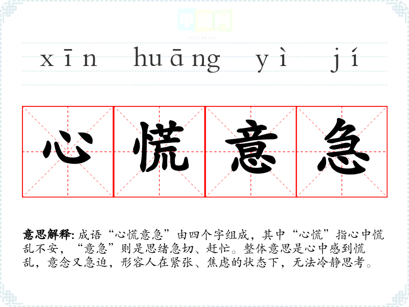 成语“心慌意急”由四个字组成,其中“心慌”指心中慌乱不安,“意急”则是思绪急切、赶忙。整体意思是心中感到慌乱,意念又急迫,形容人在紧张、焦虑的状态下,无法冷静思考。