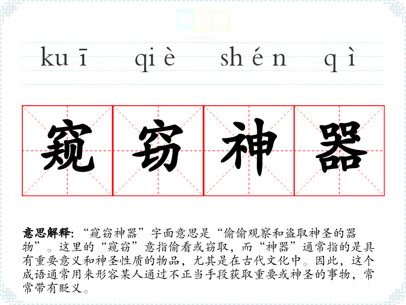 “窥窃神器”字面意思是“偷偷观察和盗取神圣的器物”。这里的“窥窃”意指偷看或窃取,而“神器”通常指的是具有重要意义和神圣性质的物品,尤其是在古代文化中。因此,这个成语通常用来形容某人通过不正当手段获取重要或神圣的事物,常常带有贬义。