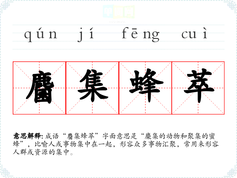 成语“麕集蜂萃”字面意思是“麇集的动物和聚集的蜜蜂”,比喻人或事物集中在一起,形容众多事物汇聚,常用来形容人群或资源的集中。