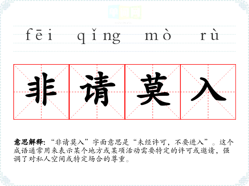 “非请莫入”字面意思是“未经许可,不要进入”。这个成语通常用来表示某个地方或某项活动需要特定的许可或邀请,强调了对私人空间或特定场合的尊重。