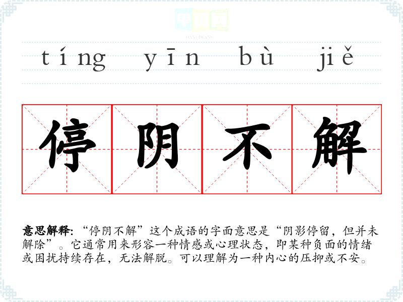 “停阴不解”这个成语的字面意思是“阴影停留,但并未解除”。它通常用来形容一种情感或心理状态,即某种负面的情绪或困扰持续存在,无法解脱。可以理解为一种内心的压抑或不安。