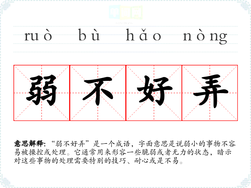 “弱不好弄”是一个成语,字面意思是说弱小的事物不容易被操控或处理。它通常用来形容一些脆弱或者无力的状态,暗示对这些事物的处理需要特别的技巧、耐心或是不易。