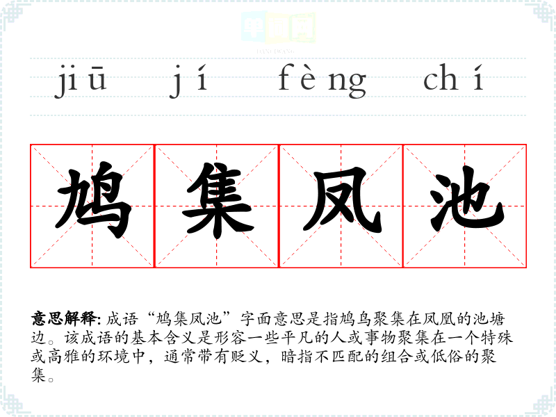 成语“鸠集凤池”字面意思是指鸠鸟聚集在凤凰的池塘边。该成语的基本含义是形容一些平凡的人或事物聚集在一个特殊或高雅的环境中,通常带有贬义,暗指不匹配的组合或低俗的聚集。