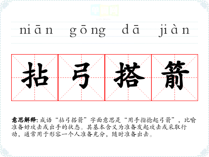 成语“拈弓搭箭”字面意思是“用手指捻起弓箭”,比喻准备好攻击或出手的状态。其基本含义为准备发起攻击或采取行动,通常用于形容一个人准备充分,随时准备出击。