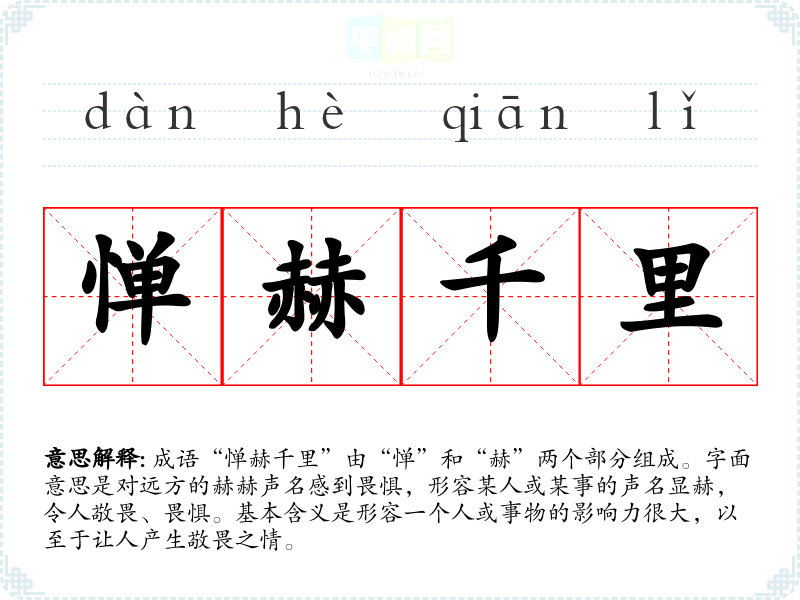 成语“惮赫千里”由“惮”和“赫”两个部分组成。字面意思是对远方的赫赫声名感到畏惧,形容某人或某事的声名显赫,令人敬畏、畏惧。基本含义是形容一个人或事物的影响力很大,以至于让人产生敬畏之情。