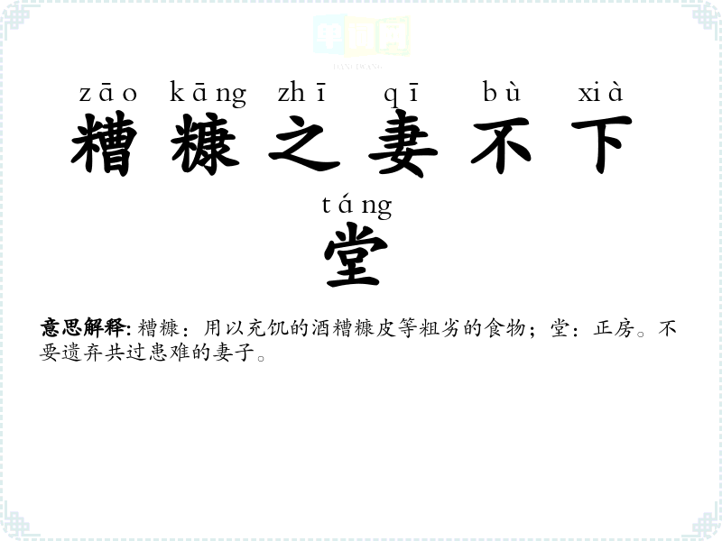 | 糟糠之妇 | 糟糠:穷人用来充饥的酒渣、米糠等粗劣食物。指共过患难的妻子 |