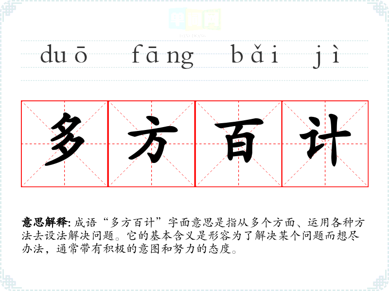 成语“多方百计”字面意思是指从多个方面、运用各种方法去设法解决问题。它的基本含义是形容为了解决某个问题而想尽办法,通常带有积极的意图和努力的态度。