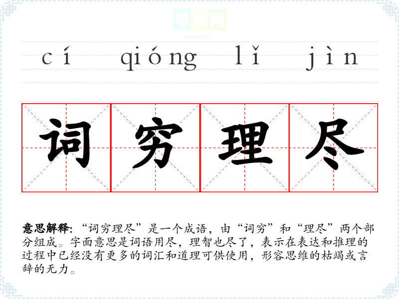 “词穷理尽”是一个成语,由“词穷”和“理尽”两个部分组成。字面意思是词语用尽,理智也尽了,表示在表达和推理的过程中已经没有更多的词汇和道理可供使用,形容思维的枯竭或言辞的无力。