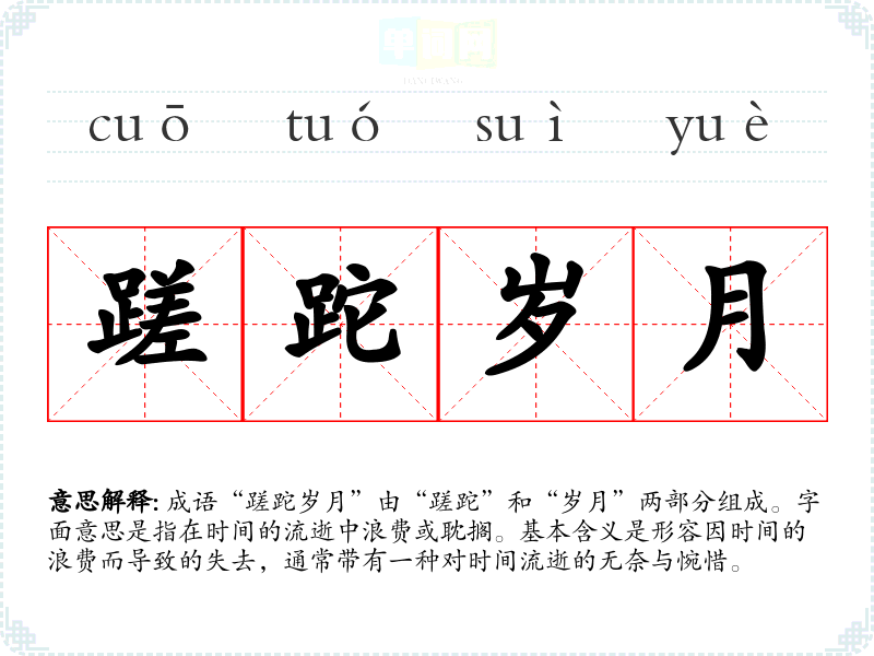 成语“蹉跎岁月”由“蹉跎”和“岁月”两部分组成。字面意思是指在时间的流逝中浪费或耽搁。基本含义是形容因时间的浪费而导致的失去,通常带有一种对时间流逝的无奈与惋惜。