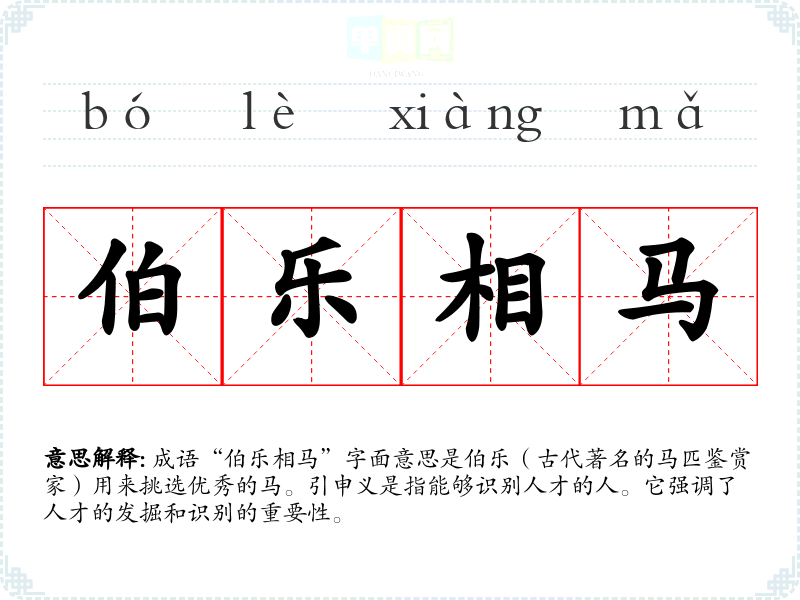 成语“伯乐相马”字面意思是伯乐(古代著名的马匹鉴赏家)用来挑选优秀的马。引申义是指能够识别人才的人。它强调了人才的发掘和识别的重要性。