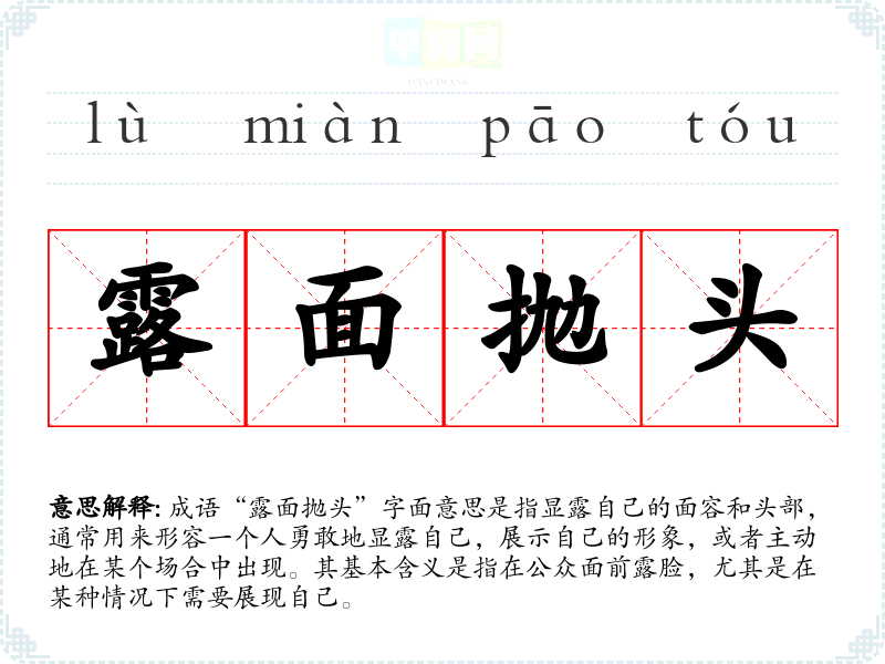成语“露面抛头”字面意思是指显露自己的面容和头部,通常用来形容一个人勇敢地显露自己,展示自己的形象,或者主动地在某个场合中出现。其基本含义是指在公众面前露脸,尤其是在某种情况下需要展现自己。