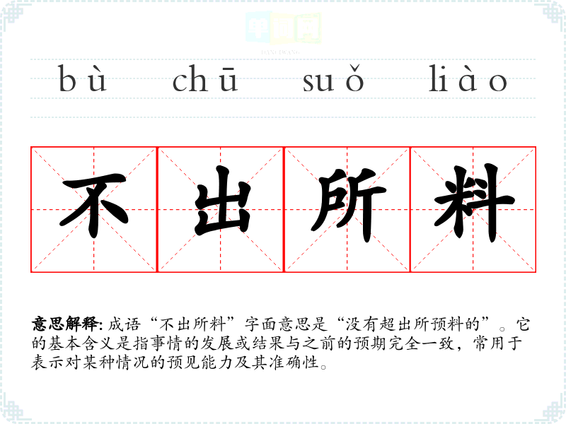 成语“不出所料”字面意思是“没有超出所预料的”。它的基本含义是指事情的发展或结果与之前的预期完全一致,常用于表示对某种情况的预见能力及其准确性。