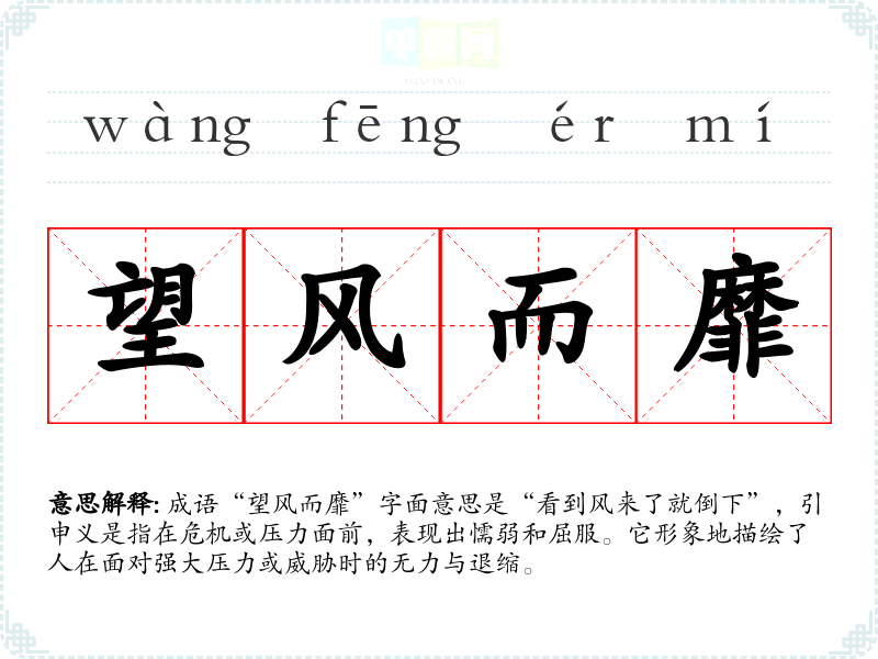 成语“望风而靡”字面意思是“看到风来了就倒下”,引申义是指在危机或压力面前,表现出懦弱和屈服。它形象地描绘了人在面对强大压力或威胁时的无力与退缩。