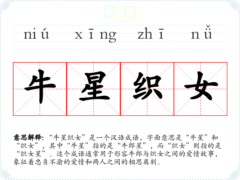 “牛星织女”是一个汉语成语,字面意思是“牛星”和“织女”,其中“牛星”指的是“牛郎星”,而“织女”则指的是“织女星”。这个成语通常用于形容牛郎与织女之间的爱情故事,象征着忠贞不渝的爱情和两人之间的相思离别。