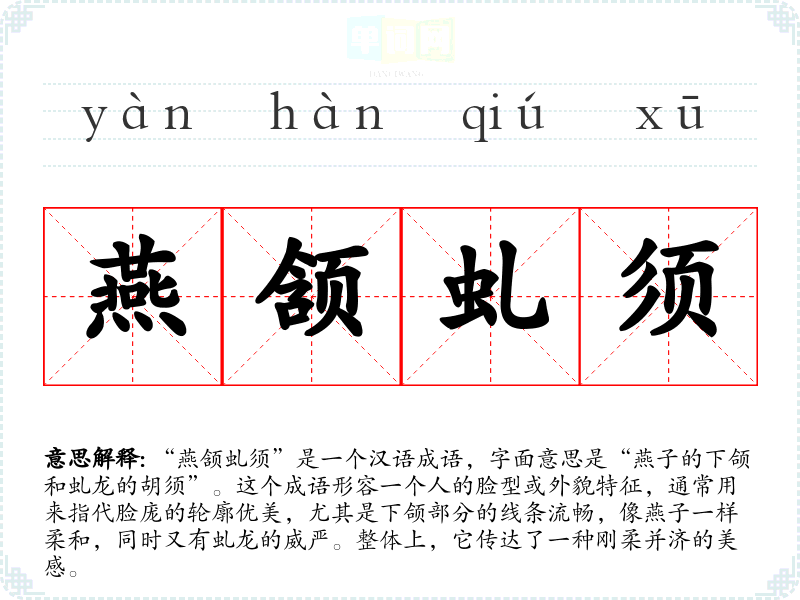 “燕颔虬须”是一个汉语成语,字面意思是“燕子的下颌和虬龙的胡须”。这个成语形容一个人的脸型或外貌特征,通常用来指代脸庞的轮廓优美,尤其是下颌部分的线条流畅,像燕子一样柔和,同时又有虬龙的威严。整体上,它传达了一种刚柔并济的美感。