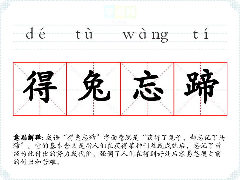 成语“得兔忘蹄”字面意思是“获得了兔子,却忘记了马蹄”。它的基本含义是指人们在获得某种利益或成就后,忘记了曾经为此付出的努力或代价。强调了人们在得到好处后容易忽视之前的付出和苦难。