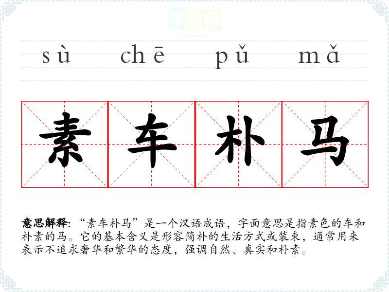 “素车朴马”是一个汉语成语,字面意思是指素色的车和朴素的马。它的基本含义是形容简朴的生活方式或装束,通常用来表示不追求奢华和繁华的态度,强调自然、真实和朴素。