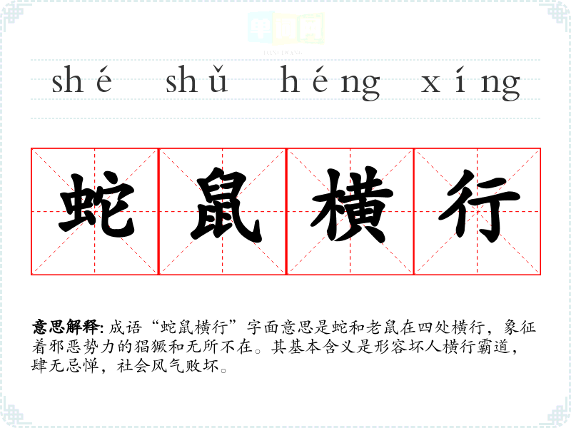 成语“蛇鼠横行”字面意思是蛇和老鼠在四处横行,象征着邪恶势力的猖獗和无所不在。其基本含义是形容坏人横行霸道,肆无忌惮,社会风气败坏。