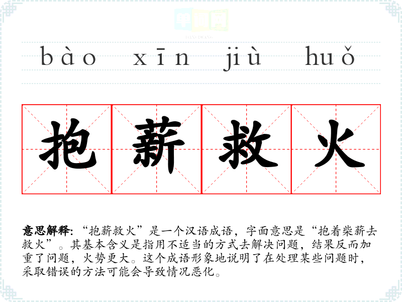 “抱薪救火”是一个汉语成语,字面意思是“抱着柴薪去救火”。其基本含义是指用不适当的方式去解决问题,结果反而加重了问题,火势更大。这个成语形象地说明了在处理某些问题时,采取错误的方法可能会导致情况恶化。