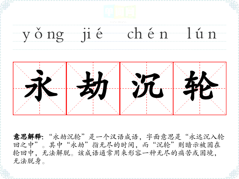 “永劫沉轮”出自思想,特别是与轮回(生死循环)相关的教义。在中,生命的循环被视为一种苦难,解脱则是最终的目标。这个成语反映了人们对轮回与苦难的深刻思考,常常用于表达对生命无常和苦难的感慨。
