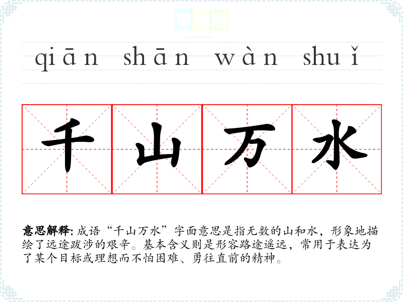 成语“千山万水”字面意思是指无数的山和水,形象地描绘了远途跋涉的艰辛。基本含义则是形容路途遥远,常用于表达为了某个目标或理想而不怕困难、勇往直前的精神。