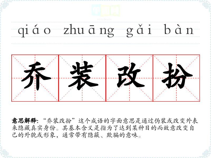 | 乔妆改扮 | 乔:做假。乔妆:改变服装、容颜。指化妆改变形象,掩饰本来的身份。亦作“乔装打扮”、“乔装改扮”。 |