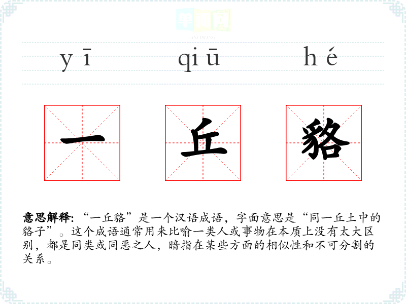 “一丘貉”是一个汉语成语,字面意思是“同一丘土中的貉子”。这个成语通常用来比喻一类人或事物在本质上没有太大区别,都是同类或同恶之人,暗指在某些方面的相似性和不可分割的关系。