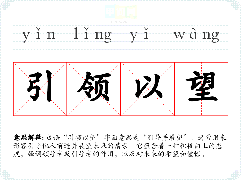 成语“引领以望”字面意思是“引导并展望”,通常用来形容引导他人前进并展望未来的情景。它蕴含着一种积极向上的态度,强调领导者或引导者的作用,以及对未来的希望和憧憬。