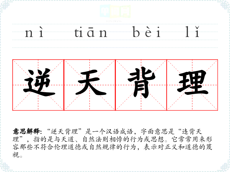 “逆天背理”是一个汉语成语,字面意思是“违背天理”,指的是与天道、自然法则相悖的行为或思想。它常常用来形容那些不符合伦理道德或自然规律的行为,表示对正义和道德的蔑视。
