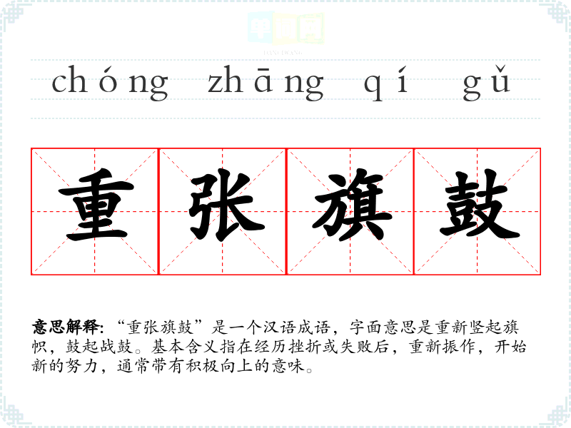 “重张旗鼓”是一个汉语成语,字面意思是重新竖起旗帜,鼓起战鼓。基本含义指在经历挫折或失败后,重新振作,开始新的努力,通常带有积极向上的意味。