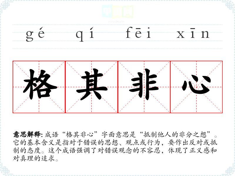 成语“格其非心”字面意思是“抵制他人的非分之想”。它的基本含义是指对于错误的思想、观点或行为,要作出反对或抵制的态度。这个成语强调了对错误观念的不容忍,体现了正义感和对真理的追求。