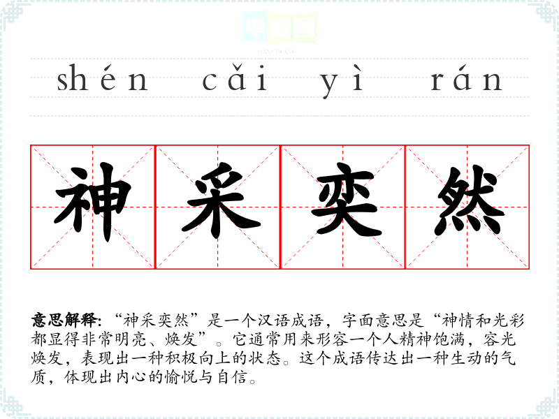 | 神彩奕奕 | 奕奕:精神焕发的样子。形容精神旺盛,容光焕发。 |