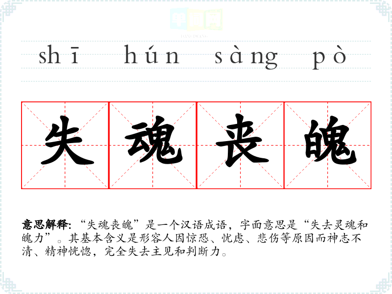 | 亡魂失魄 | 魂、魄:旧指人身中离开形体能存在的精神为魂,依附形体而显现的精神为魄。形容惊慌忧虑、心神不定、行动失常的样子。 |