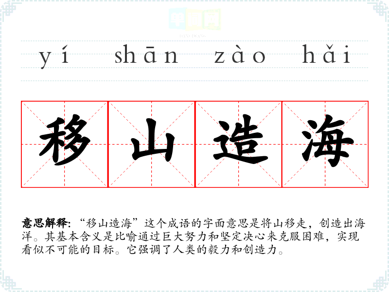 “移山造海”这个成语的字面意思是将山移走,创造出海洋。其基本含义是比喻通过巨大努力和坚定决心来克服困难,实现看似不可能的目标。它强调了人类的毅力和创造力。