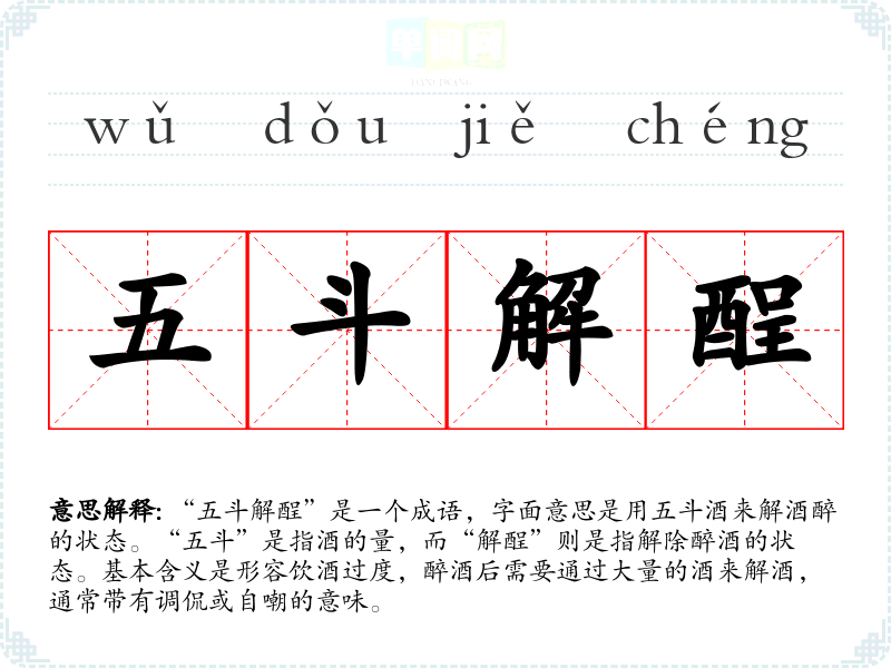 “五斗解酲”是一个成语,字面意思是用五斗酒来解酒醉的状态。“五斗”是指酒的量,而“解酲”则是指解除醉酒的状态。基本含义是形容饮酒过度,醉酒后需要通过大量的酒来解酒,通常带有调侃或自嘲的意味。