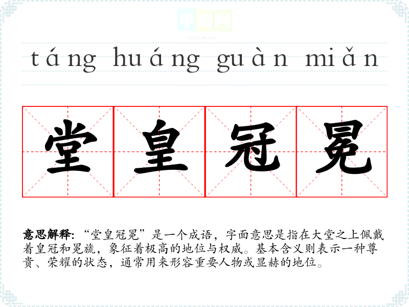 “堂皇冠冕”是一个成语,字面意思是指在大堂之上佩戴着皇冠和冕旒,象征着极高的地位与权威。基本含义则表示一种尊贵、荣耀的状态,通常用来形容重要人物或显赫的地位。