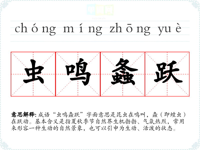 成语“虫鸣螽跃”字面意思是昆虫在鸣叫,螽(即蝗虫)在跃动。基本含义是指夏秋季节自然界生机勃勃、气氛热烈,常用来形容一种生动的自然景象,也可以引申为生动、活泼的状态。