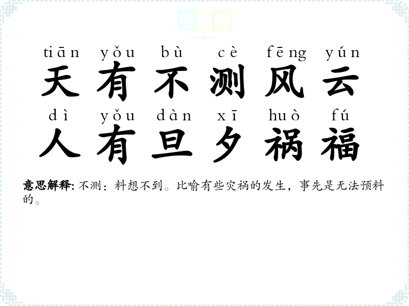 | 不测风云 | 风云:比喻变幻动荡的局势。不可预测的变幻动荡的局势。 |
