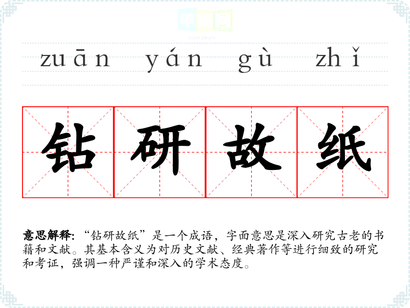 “钻研故纸”是一个成语,字面意思是深入研究古老的书籍和文献。其基本含义为对历史文献、经典著作等进行细致的研究和考证,强调一种严谨和深入的学术态度。
